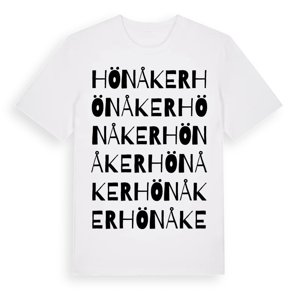 Hönåker ordlek t-shirt är inspirerad av byn Hönåker i Gävleborgs län, Sverige. Tröjan är designad för dig som har en speciell koppling till platsen – oavsett om du bor här, har rötterna här eller bara älskar Hönåker.