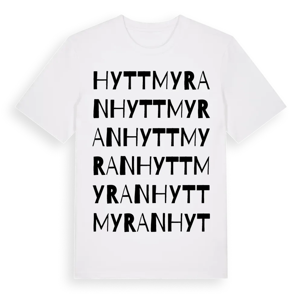 Hyttmyran ordlek t-shirt är inspirerad av Hyttmyran i Gävleborgs län, Sverige. Tröjan är designad för dig som har en speciell koppling till platsen – oavsett om du bor här, har rötterna här eller bara älskar Hyttmyran.