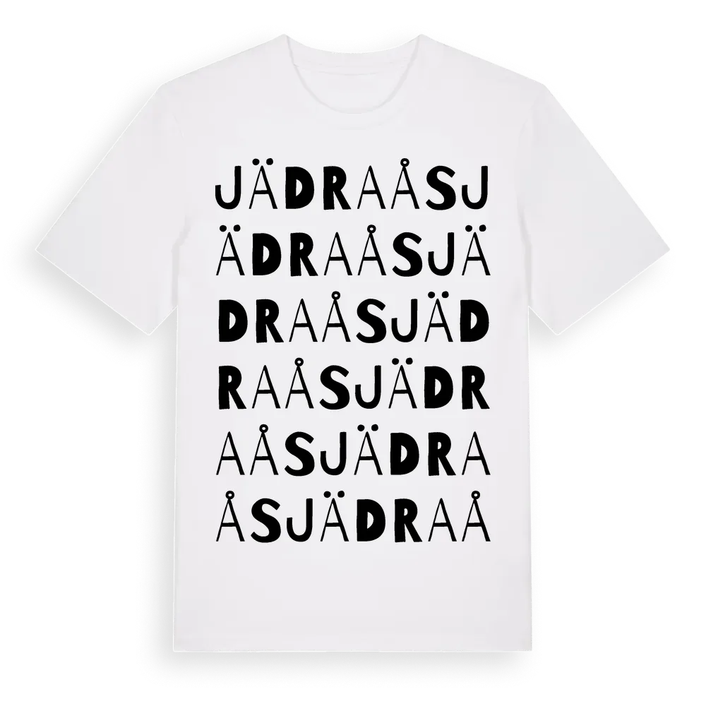 Jädraås ordlek t-shirt är inspirerad av byn Jädraås i Gävleborgs län, Sverige. Tröjan är designad för dig som har en speciell koppling till platsen – oavsett om du bor här, har rötterna här eller bara älskar Jädraås.