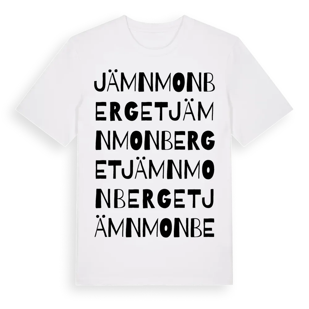 Jämnmonberget ordlek t-shirt är inspirerad av Jämnmonberget i Gävleborgs län, Sverige. Tröjan är designad för dig som har en speciell koppling till platsen – oavsett om du bor här, har rötterna här eller bara älskar Jämnmonberget.