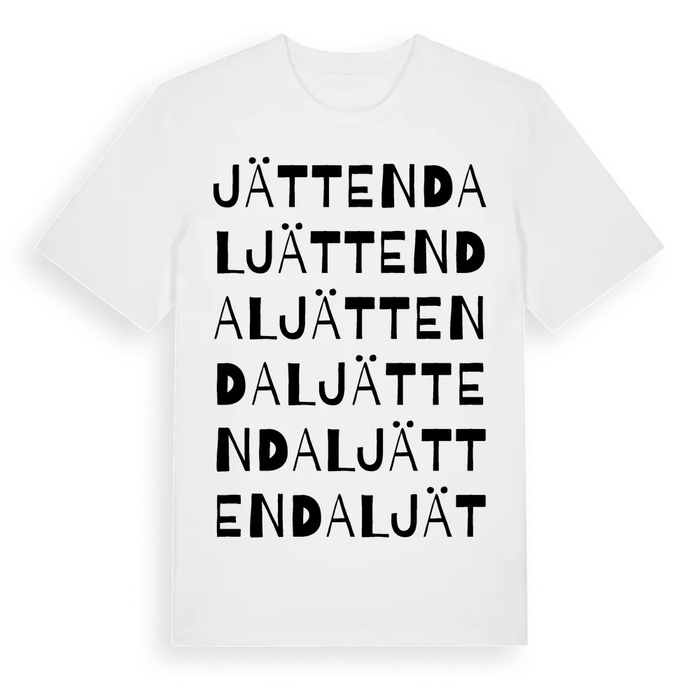 Jättendal ordlek t-shirt är inspirerad av byn Jättendal i Gävleborgs län, Sverige. Tröjan är designad för dig som har en speciell koppling till platsen – oavsett om du bor här, har rötterna här eller bara älskar Jättendal.