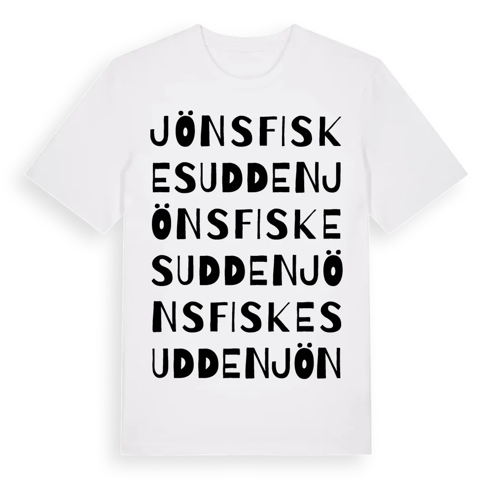 Jönsfiskesudden ordlek t-shirt är inspirerad av Jönsfiskesudden i Gävleborgs län, Sverige. Tröjan är designad för dig som har en speciell koppling till platsen – oavsett om du bor här, har rötterna här eller bara älskar Jönsfiskesudden.