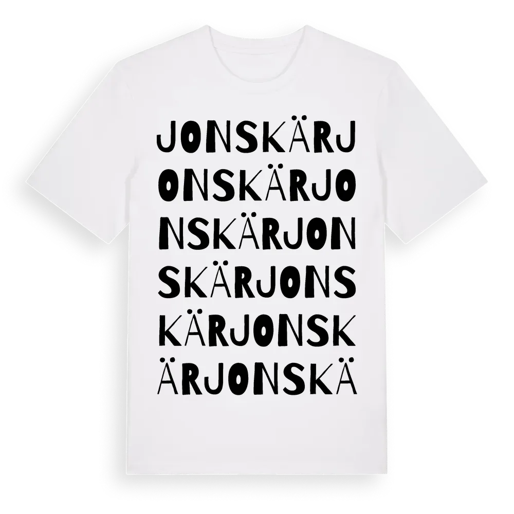 Jonskär ordlek t-shirt är inspirerad av byn Jonskär i Gävleborgs län, Sverige. Tröjan är designad för dig som har en speciell koppling till platsen – oavsett om du bor här, har rötterna här eller bara älskar Jonskär.
