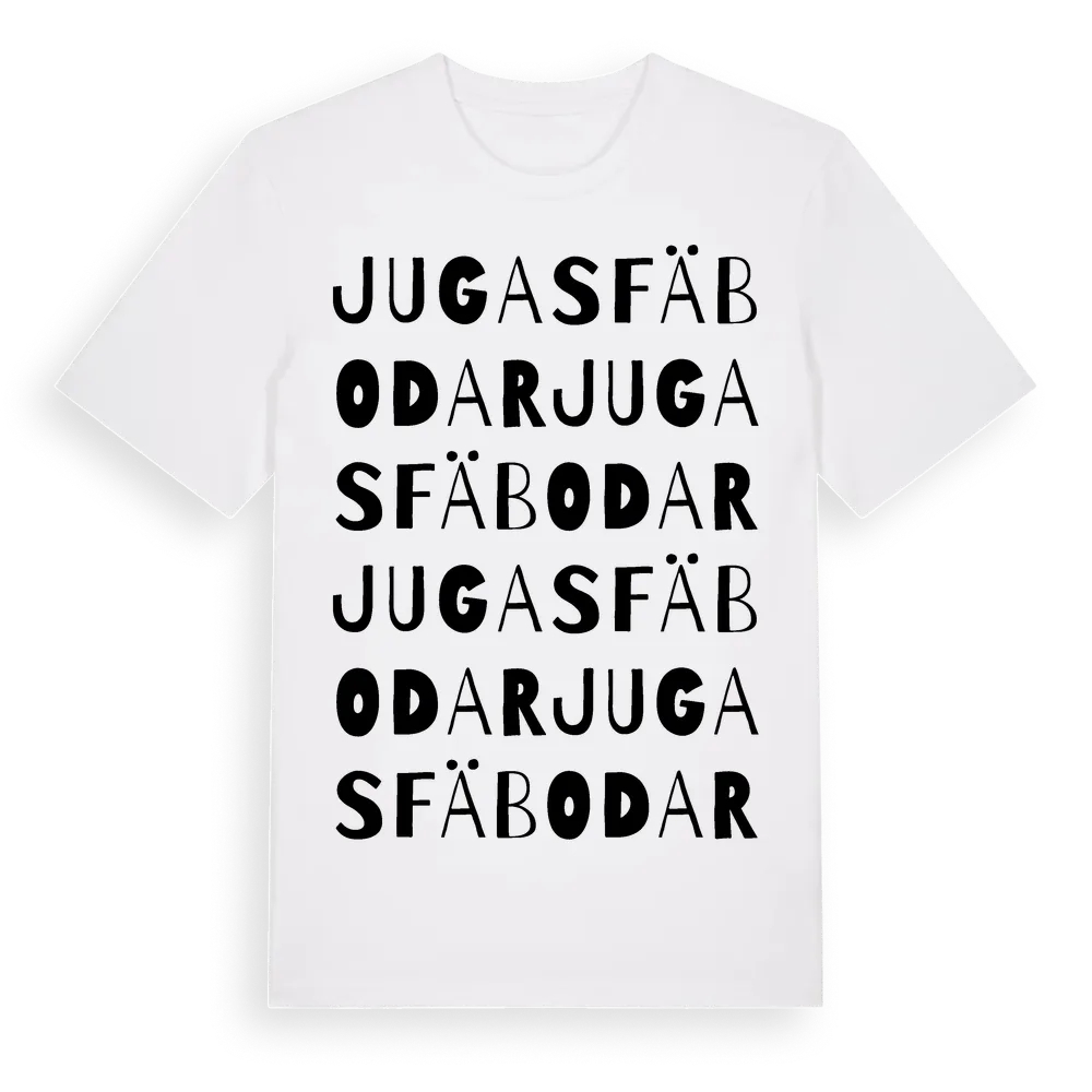 En ordlek byggd på Jugas Fäbodars namn. Subtilt och klurig – ett motiv som bara de som verkligen känner platsen fullt ut förstår. Premium bomull, unisex – från Jugas Fäbodar i Gävleborgs län.