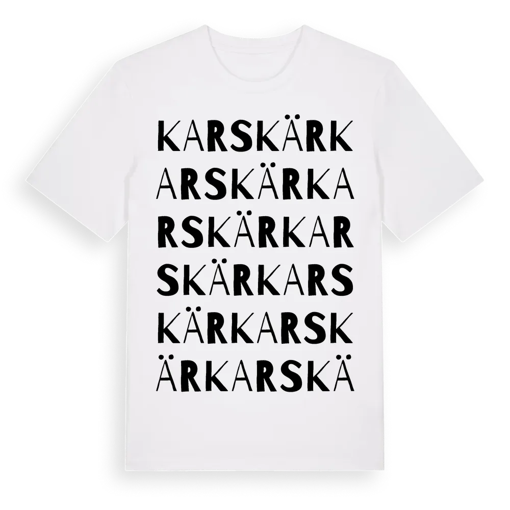 Karskär ordlek t-shirt är inspirerad av byn Karskär i Gävleborgs län, Sverige. Tröjan är designad för dig som har en speciell koppling till platsen – oavsett om du bor här, har rötterna här eller bara älskar Karskär.