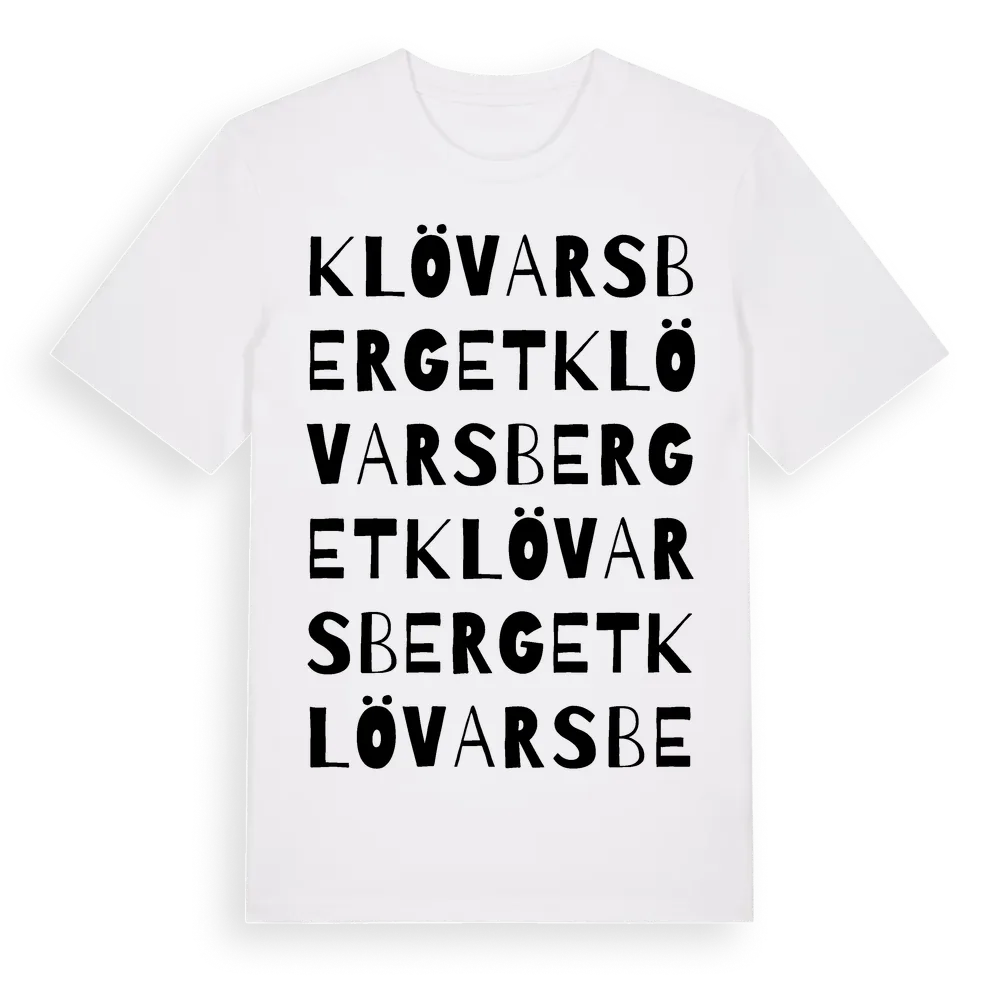 Klövarsberget ordlek t-shirt är inspirerad av Klövarsberget i Gävleborgs län, Sverige. Tröjan är designad för dig som har en speciell koppling till platsen – oavsett om du bor här, har rötterna här eller bara älskar Klövarsberget.
