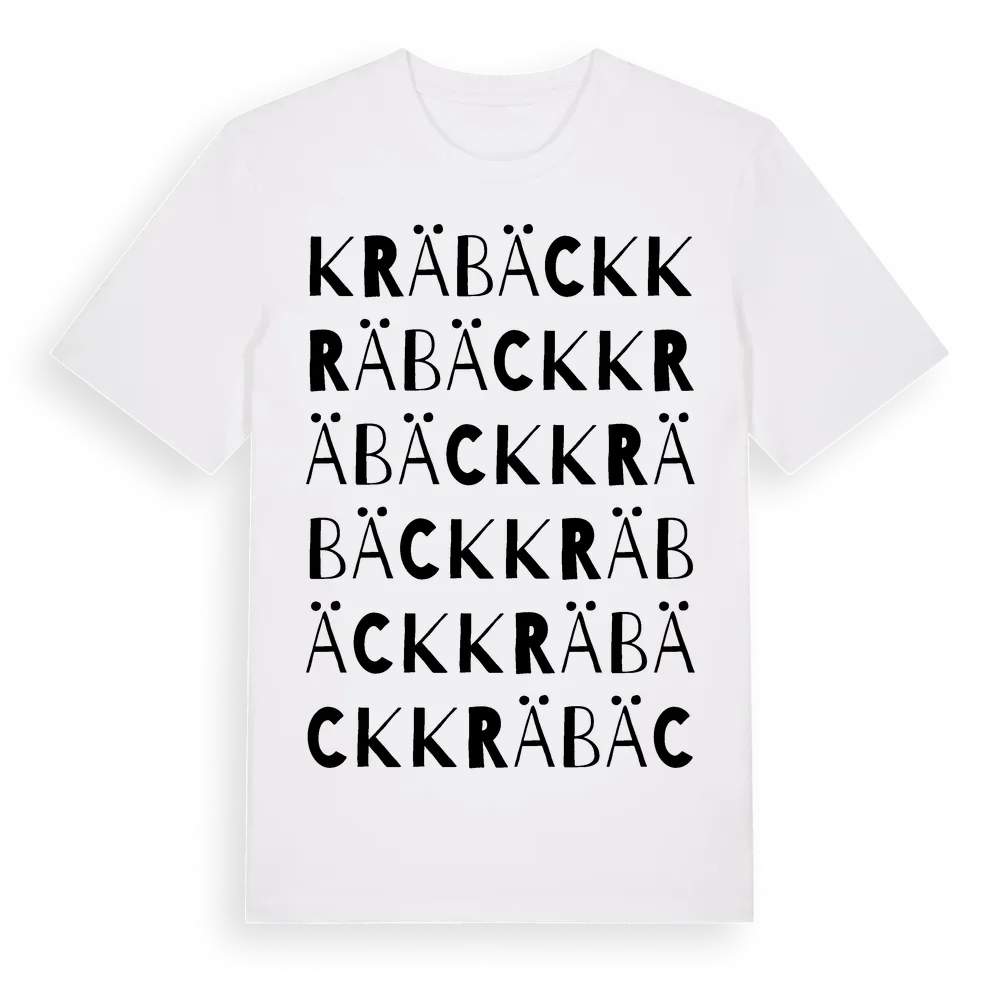 Kräbäck ordlek t-shirt är inspirerad av Kräbäck i Gävleborgs län, Sverige. Tröjan är designad för dig som har en speciell koppling till platsen – oavsett om du bor här, har rötterna här eller bara älskar Kräbäck.