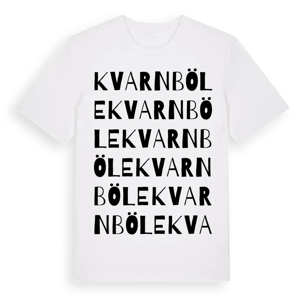 Kvarnböle ordlek t-shirt är inspirerad av byn Kvarnböle i Gävleborgs län, Sverige. Tröjan är designad för dig som har en speciell koppling till platsen – oavsett om du bor här, har rötterna här eller bara älskar Kvarnböle.