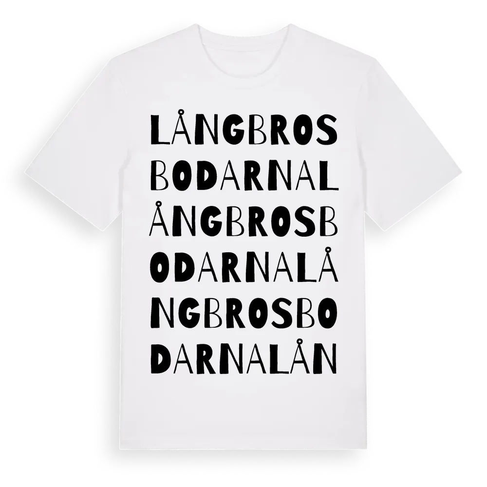 Långbrosbodarna ordlek t-shirt är inspirerad av Långbrosbodarna i Gävleborgs län, Sverige. Tröjan är designad för dig som har en speciell koppling till platsen – oavsett om du bor här, har rötterna här eller bara älskar Långbrosbodarna.