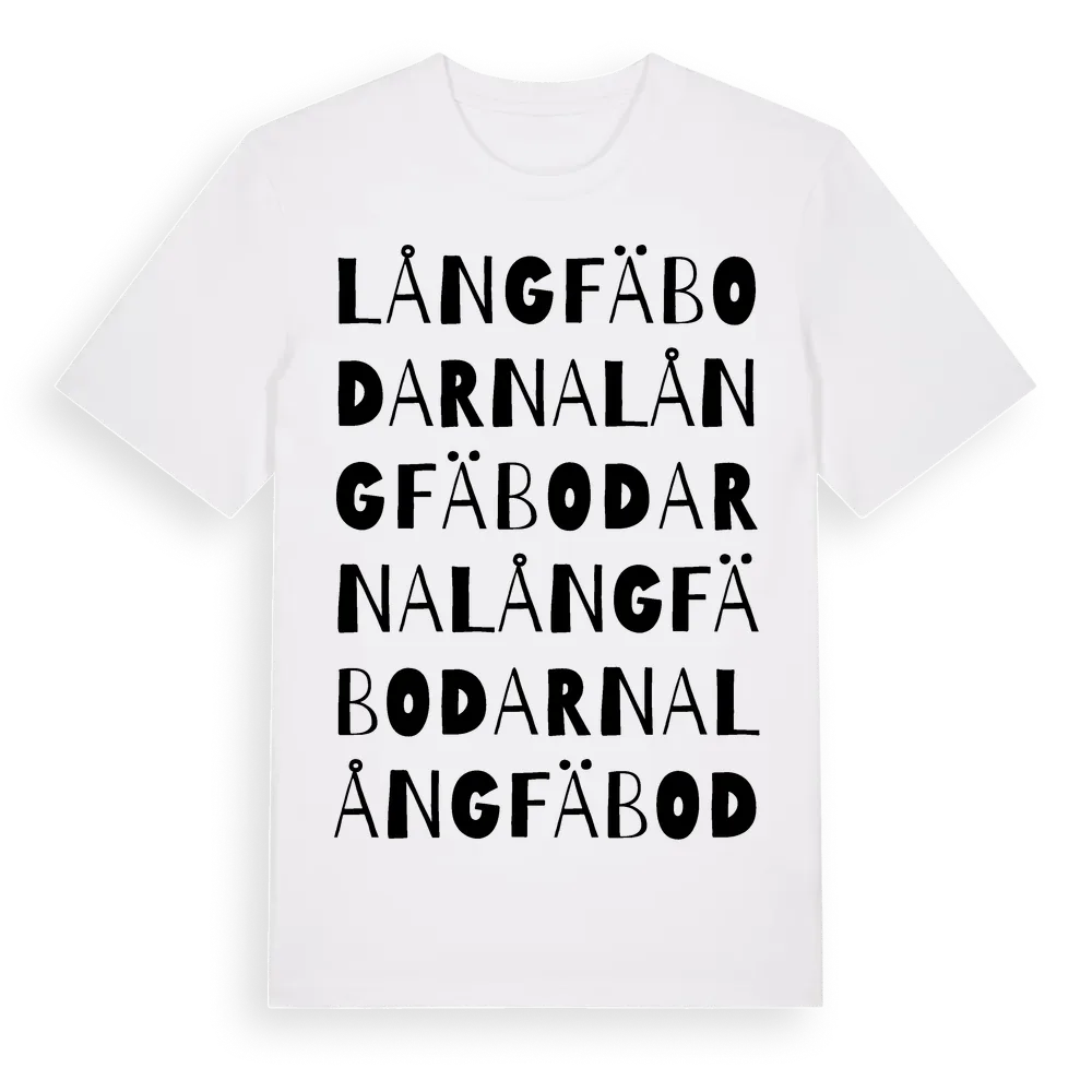 Långfäbodarna ordlek t-shirt är inspirerad av Långfäbodarna i Gävleborgs län, Sverige. Tröjan är designad för dig som har en speciell koppling till platsen – oavsett om du bor här, har rötterna här eller bara älskar Långfäbodarna.
