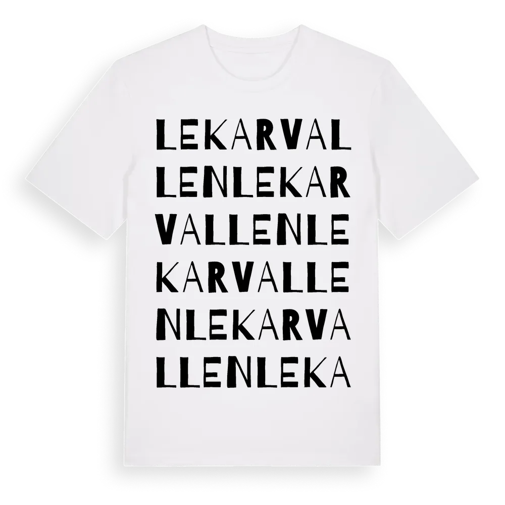 Lekarvallen ordlek t-shirt är inspirerad av Lekarvallen i Gävleborgs län, Sverige. Tröjan är designad för dig som har en speciell koppling till platsen – oavsett om du bor här, har rötterna här eller bara älskar Lekarvallen.