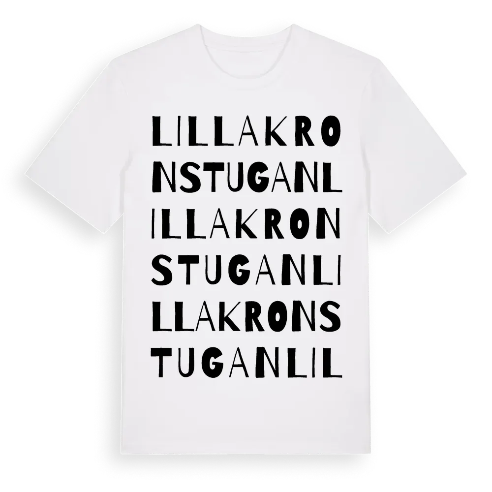 Lilla Kronstugan ordlek t-shirt är inspirerad av Lilla Kronstugan i Gävleborgs län, Sverige. Tröjan är designad för dig som har en speciell koppling till platsen – oavsett om du bor här, har rötterna här eller bara älskar Lilla Kronstugan.