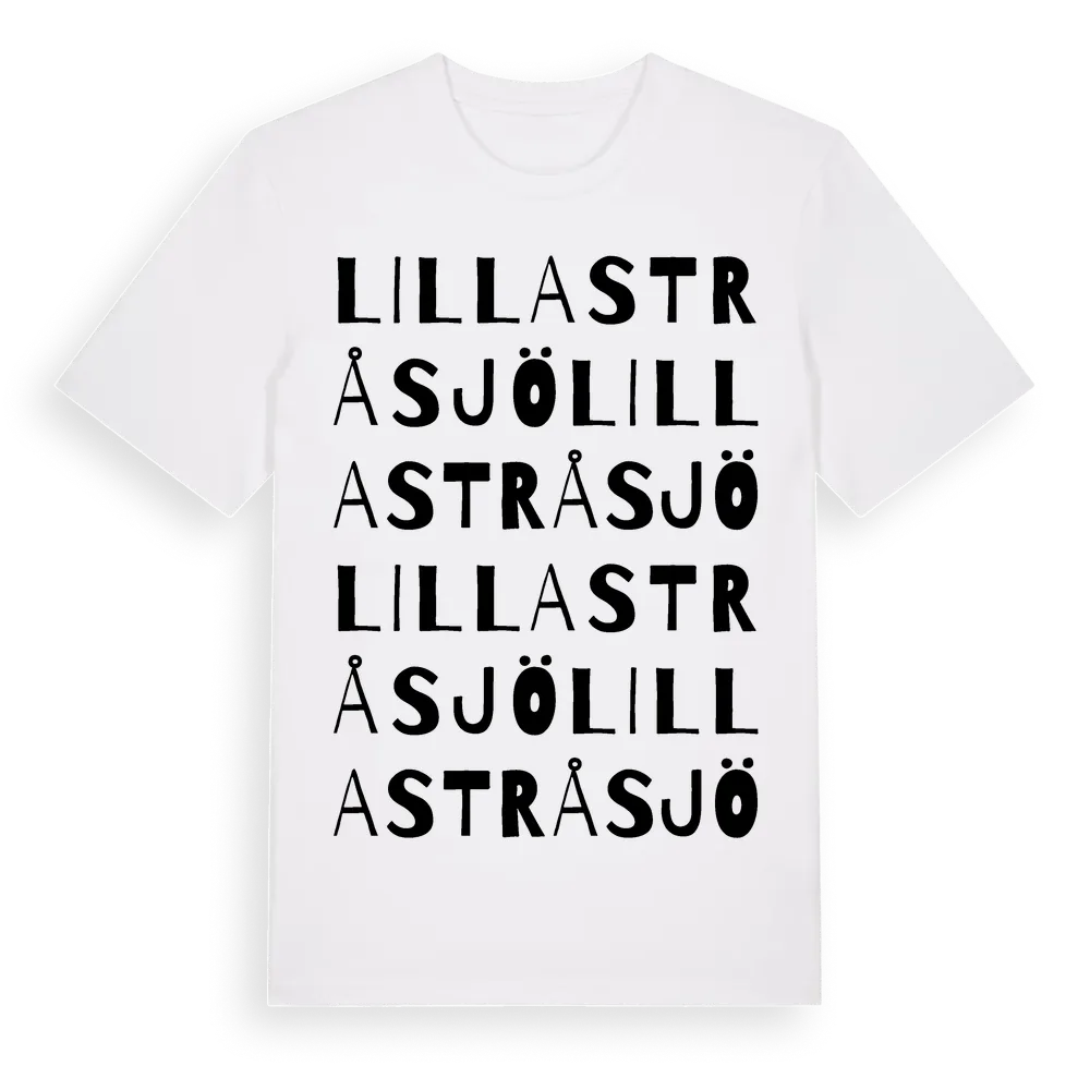 Lilla Stråsjö ordlek t-shirt är inspirerad av Lilla Stråsjö i Gävleborgs län, Sverige. Tröjan är designad för dig som har en speciell koppling till platsen – oavsett om du bor här, har rötterna här eller bara älskar Lilla Stråsjö.