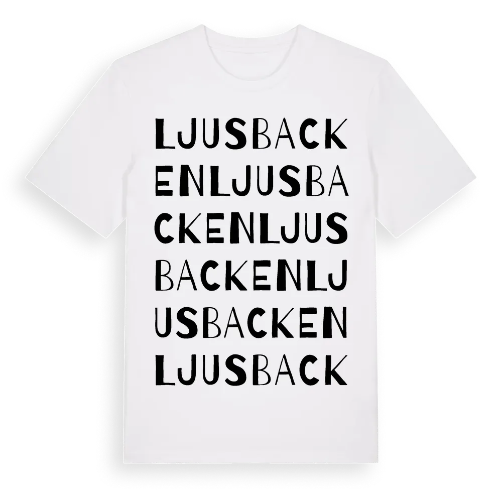 Ljusbacken ordlek t-shirt är inspirerad av Ljusbacken i Gävleborgs län, Sverige. Tröjan är designad för dig som har en speciell koppling till platsen – oavsett om du bor här, har rötterna här eller bara älskar Ljusbacken.