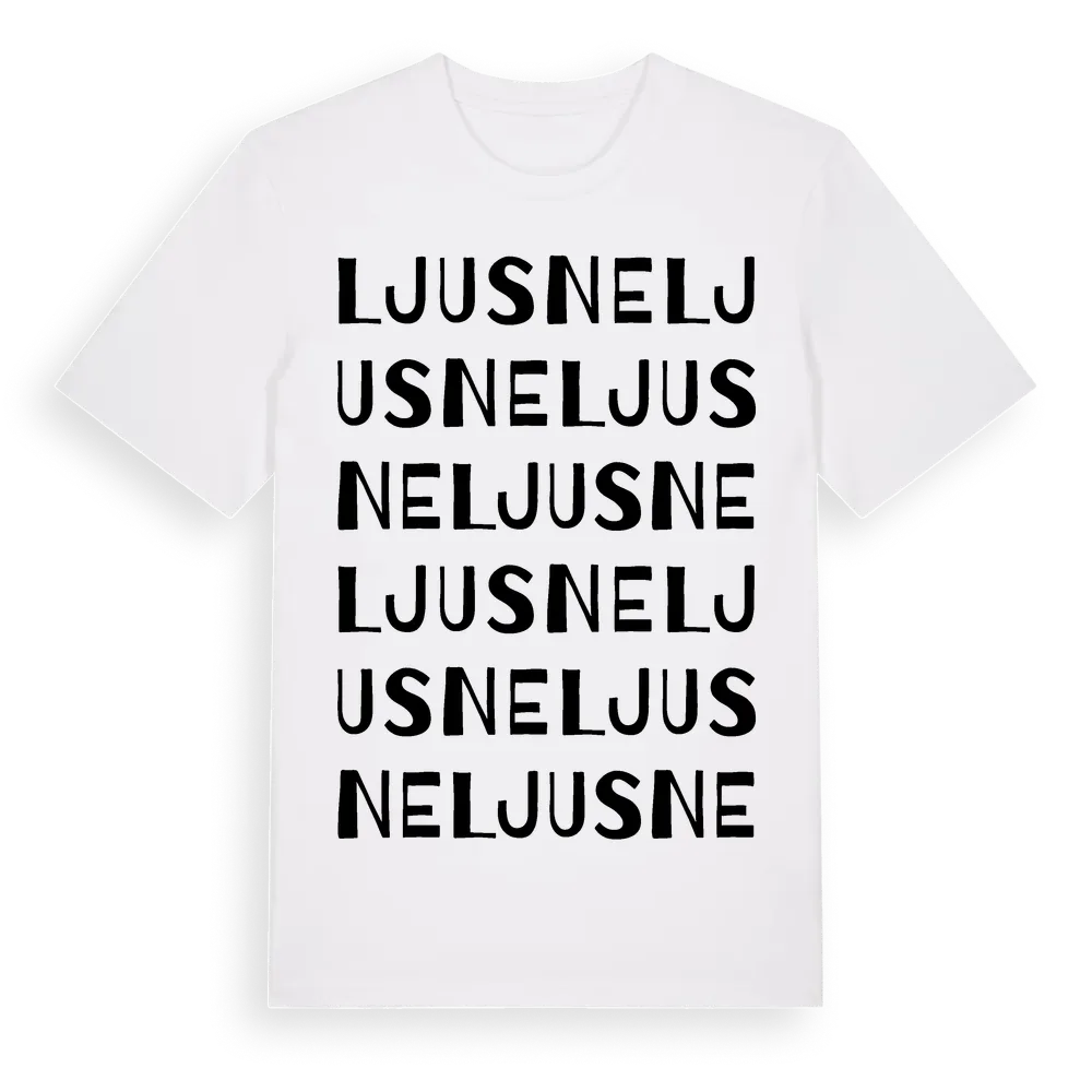 Ljusne ordlek t-shirt är inspirerad av byn Ljusne i Gävleborgs län, Sverige. Tröjan är designad för dig som har en speciell koppling till platsen – oavsett om du bor här, har rötterna här eller bara älskar Ljusne.