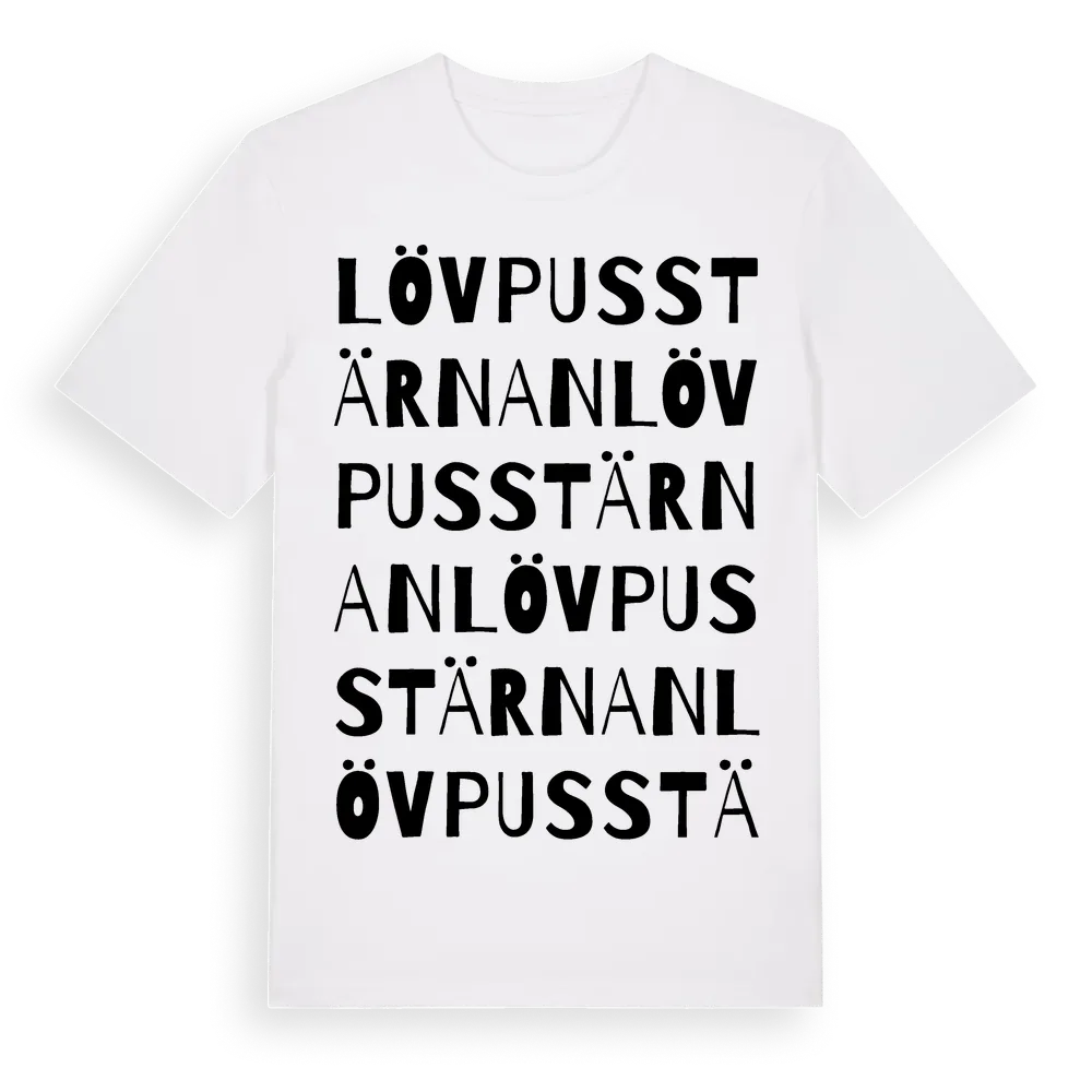 Lövpusstärnan ordlek t-shirt är inspirerad av Lövpusstärnan i Gävleborgs län, Sverige. Tröjan är designad för dig som har en speciell koppling till platsen – oavsett om du bor här, har rötterna här eller bara älskar Lövpusstärnan.