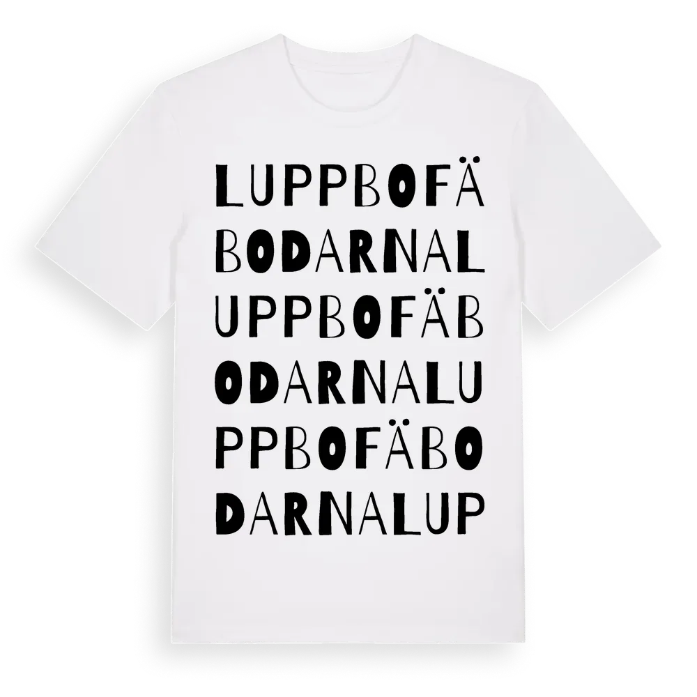 Luppbofäbodarna ordlek t-shirt är inspirerad av Luppbofäbodarna i Gävleborgs län, Sverige. Tröjan är designad för dig som har en speciell koppling till platsen – oavsett om du bor här, har rötterna här eller bara älskar Luppbofäbodarna.
