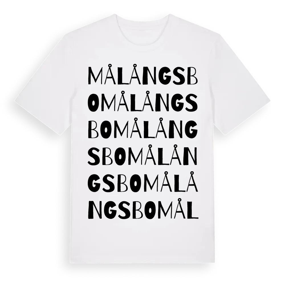 Målångsbo ordlek t-shirt är inspirerad av byn Målångsbo i Gävleborgs län, Sverige. Tröjan är designad för dig som har en speciell koppling till platsen – oavsett om du bor här, har rötterna här eller bara älskar Målångsbo.