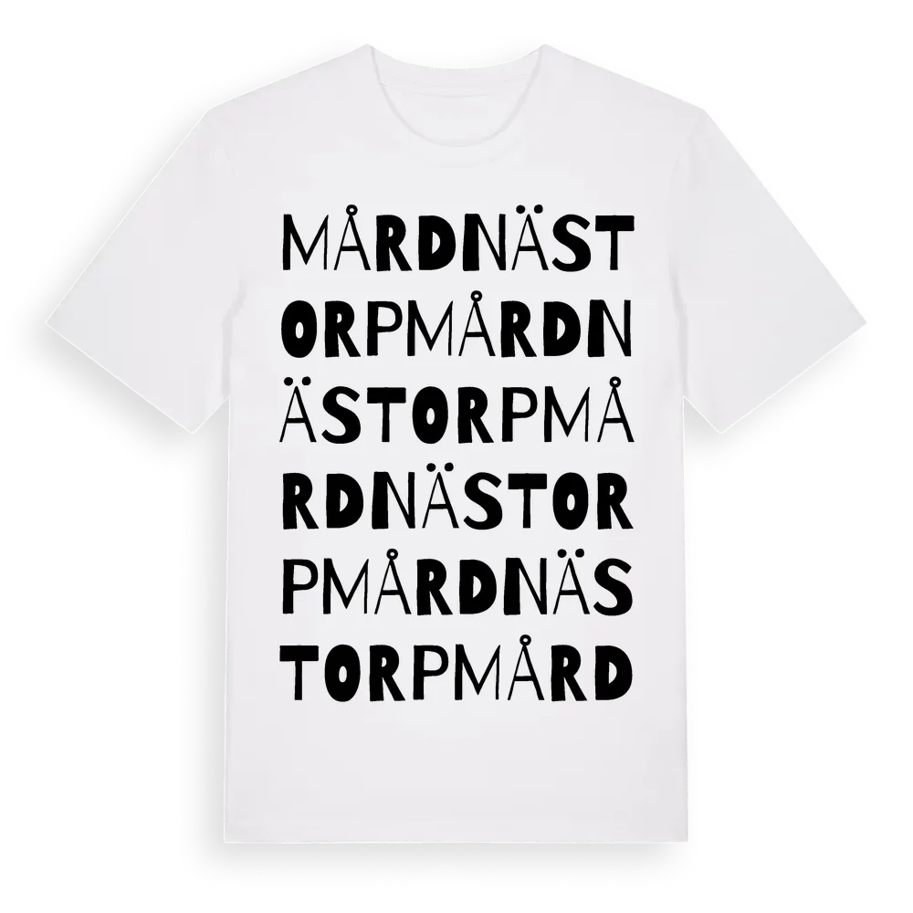 Mårdnästorp ordlek t-shirt är inspirerad av Mårdnästorp i Gävleborgs län, Sverige. Tröjan är designad för dig som har en speciell koppling till platsen – oavsett om du bor här, har rötterna här eller bara älskar Mårdnästorp.