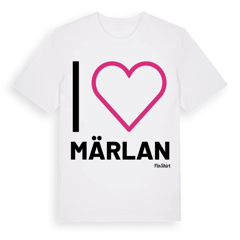 Jag älskar Märlan t-shirt stort tryck är inspirerad av byn Märlan i Gävleborgs län, Sverige. Tröjan är designad för dig som har en speciell koppling till platsen – oavsett om du bor här, har rötterna här eller bara älskar Märlan.