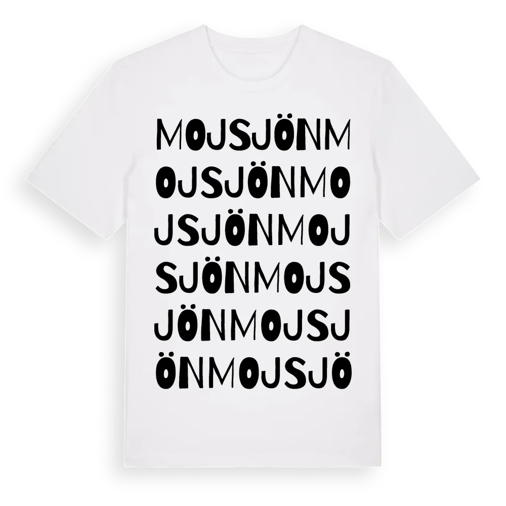 Mojsjön ordlek t-shirt är inspirerad av byn Mojsjön i Gävleborgs län, Sverige. Tröjan är designad för dig som har en speciell koppling till platsen – oavsett om du bor här, har rötterna här eller bara älskar Mojsjön.