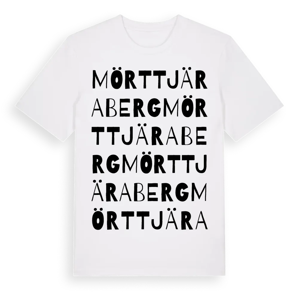 Mörttjäraberg ordlek t-shirt är inspirerad av Mörttjäraberg i Gävleborgs län, Sverige. Tröjan är designad för dig som har en speciell koppling till platsen – oavsett om du bor här, har rötterna här eller bara älskar Mörttjäraberg.