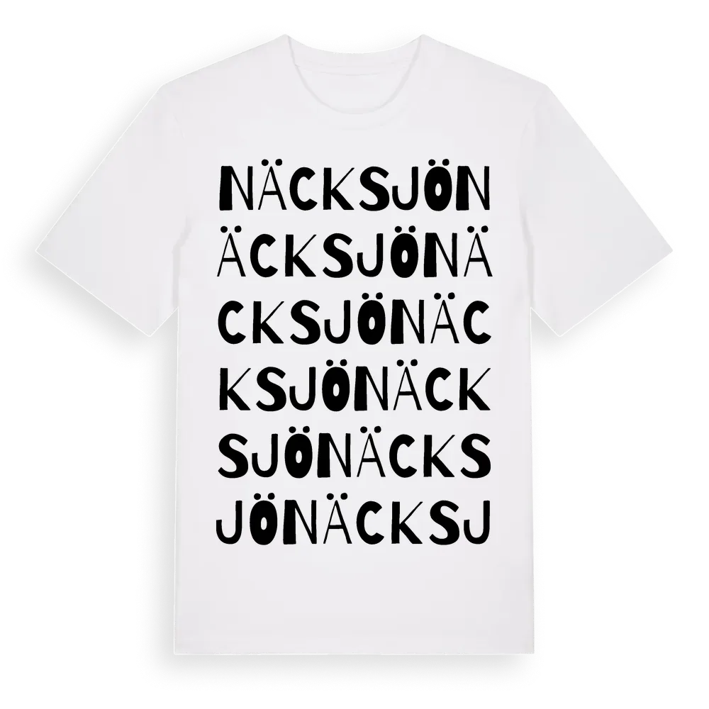 Näcksjö ordlek t-shirt är inspirerad av byn Näcksjö i Gävleborgs län, Sverige. Tröjan är designad för dig som har en speciell koppling till platsen – oavsett om du bor här, har rötterna här eller bara älskar Näcksjö.