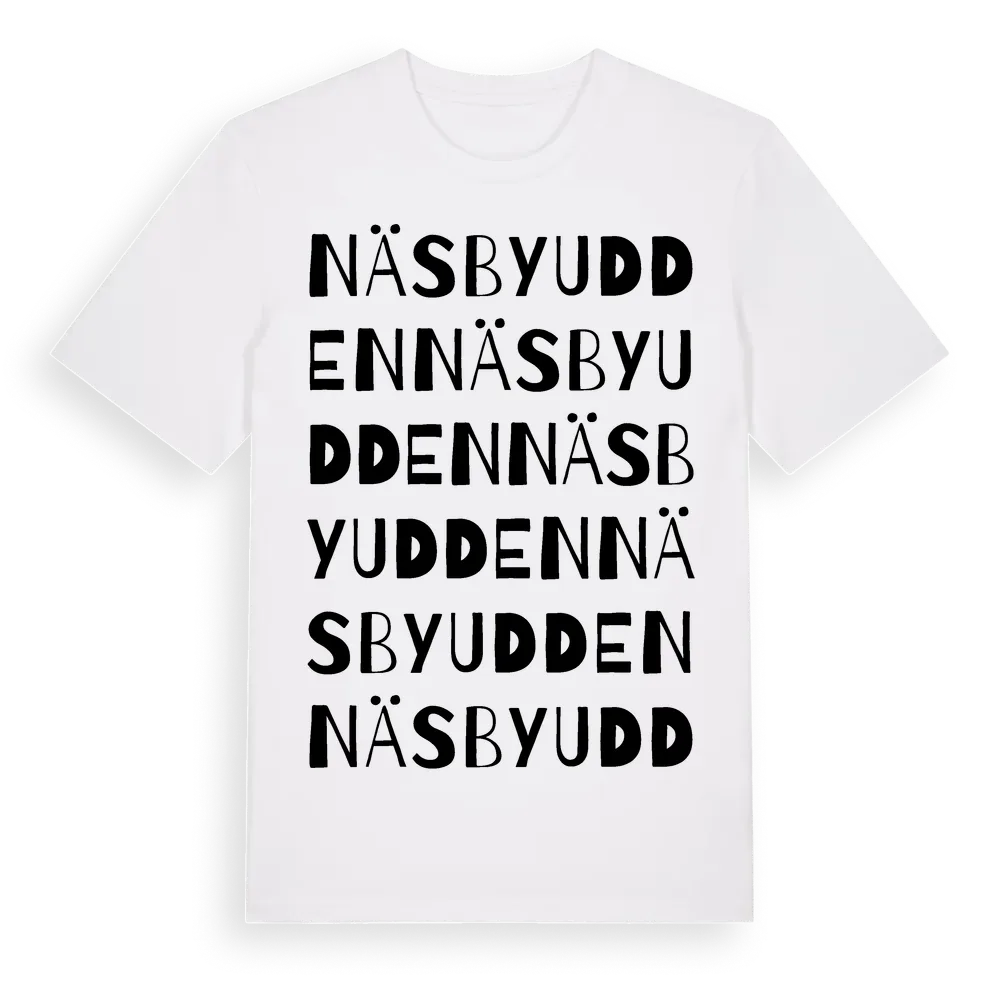 Näsbyudden ordlek t-shirt är inspirerad av Näsbyudden i Gävleborgs län, Sverige. Tröjan är designad för dig som har en speciell koppling till platsen – oavsett om du bor här, har rötterna här eller bara älskar Näsbyudden.