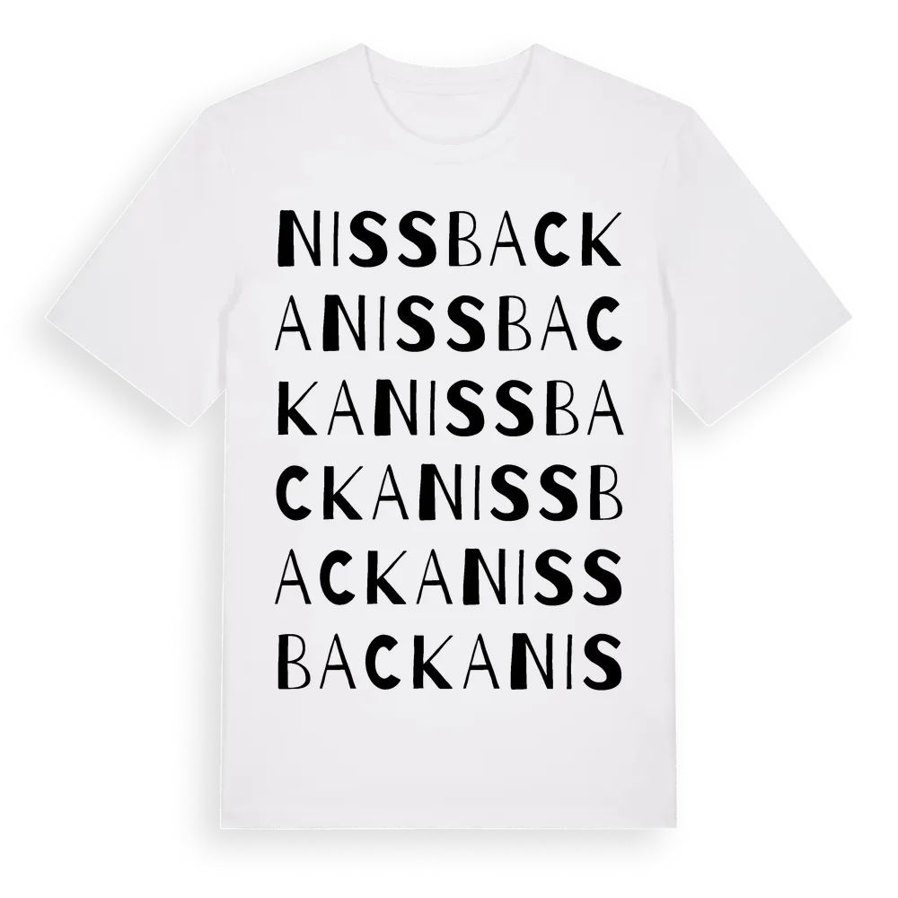 Nissbacka ordlek t-shirt är inspirerad av Nissbacka i Gävleborgs län, Sverige. Tröjan är designad för dig som har en speciell koppling till platsen – oavsett om du bor här, har rötterna här eller bara älskar Nissbacka.