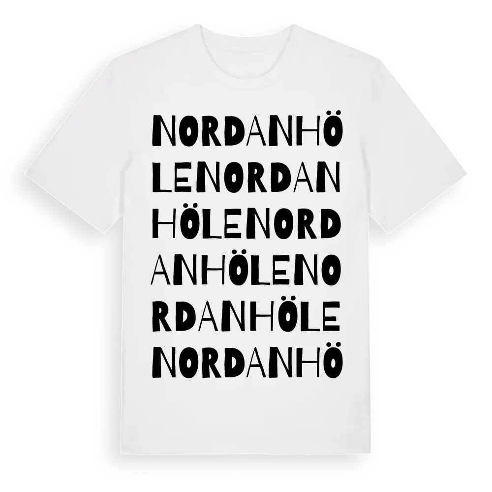 Nordanhöle ordlek t-shirt är inspirerad av byn Nordanhöle i Gävleborgs län, Sverige. Tröjan är designad för dig som har en speciell koppling till platsen – oavsett om du bor här, har rötterna här eller bara älskar Nordanhöle.