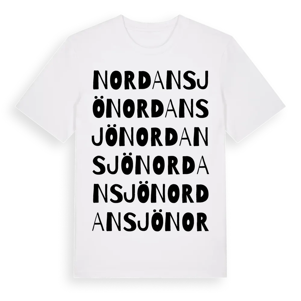Nordansjö ordlek t-shirt är inspirerad av Nordansjö i Gävleborgs län, Sverige. Tröjan är designad för dig som har en speciell koppling till platsen – oavsett om du bor här, har rötterna här eller bara älskar Nordansjö.