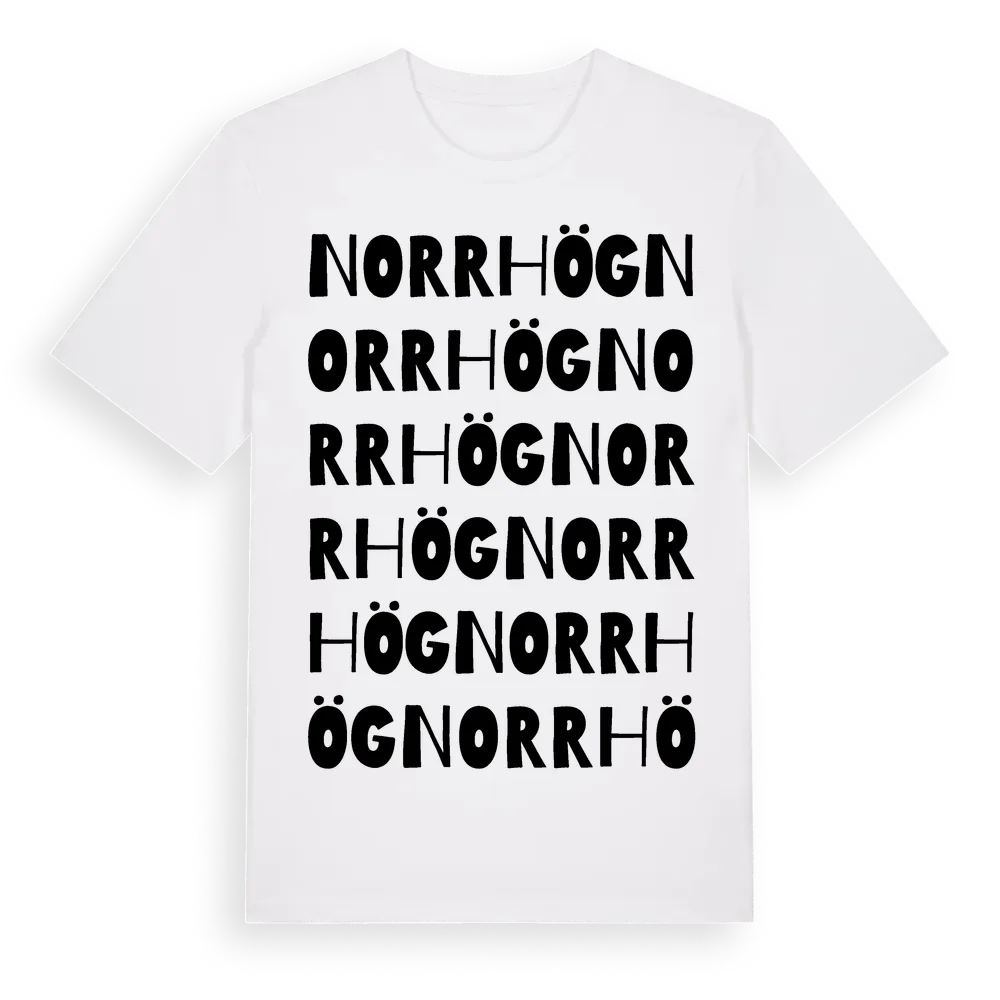 Norrhög ordlek t-shirt är inspirerad av Norrhög i Gävleborgs län, Sverige. Tröjan är designad för dig som har en speciell koppling till platsen – oavsett om du bor här, har rötterna här eller bara älskar Norrhög.