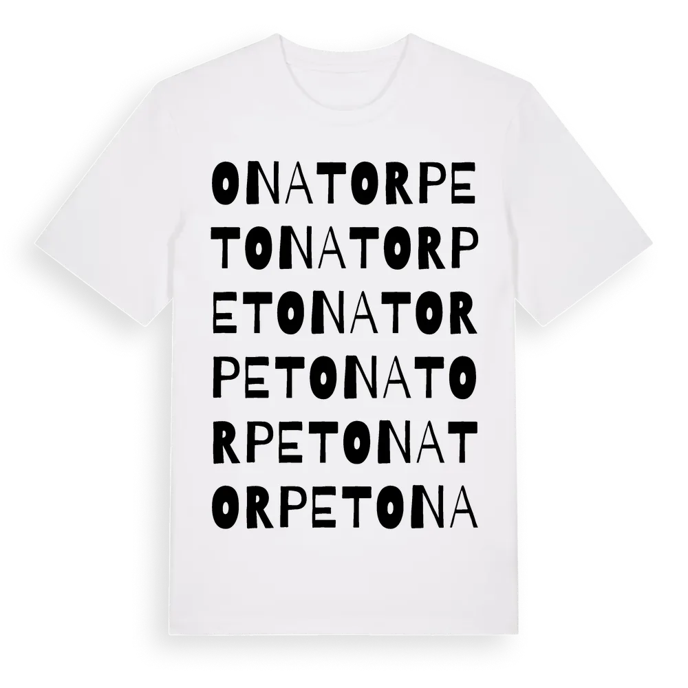 Onatorpet ordlek t-shirt är inspirerad av Onatorpet i Gävleborgs län, Sverige. Tröjan är designad för dig som har en speciell koppling till platsen – oavsett om du bor här, har rötterna här eller bara älskar Onatorpet.