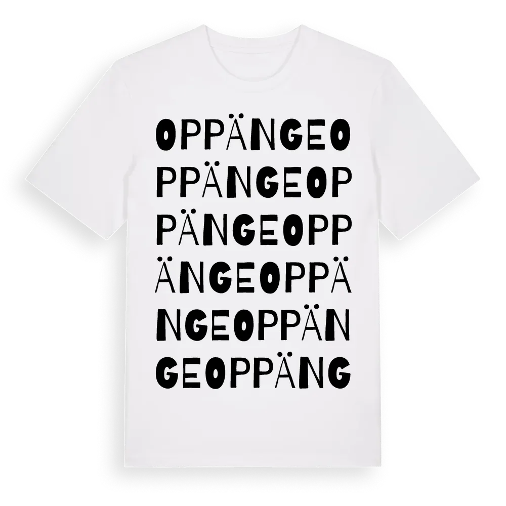 Oppänge ordlek t-shirt är inspirerad av byn Oppänge i Gävleborgs län, Sverige. Tröjan är designad för dig som har en speciell koppling till platsen – oavsett om du bor här, har rötterna här eller bara älskar Oppänge.