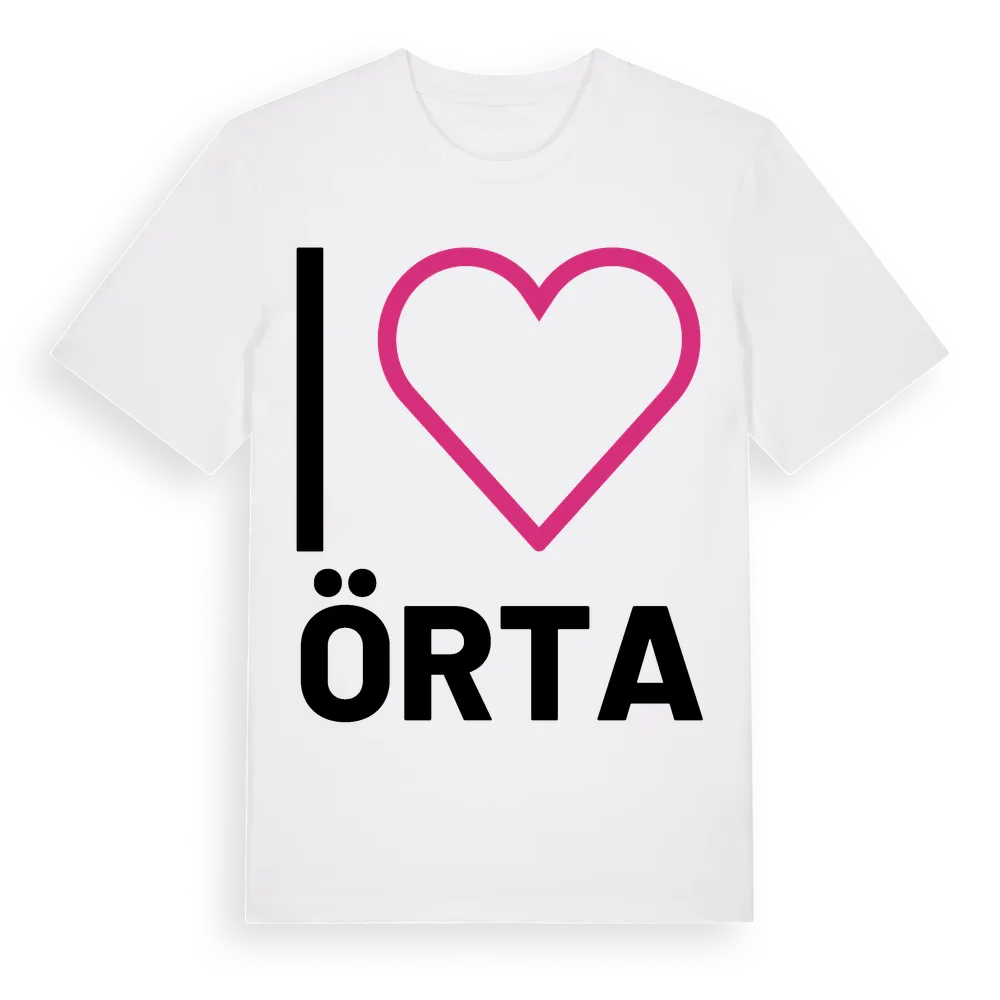 Jag älskar Örta t-shirt stort tryck är inspirerad av stadsdelen Örta i Gävleborgs län, Sverige. Tröjan är designad för dig som har en speciell koppling till platsen – oavsett om du bor här, har rötterna här eller bara älskar Örta.