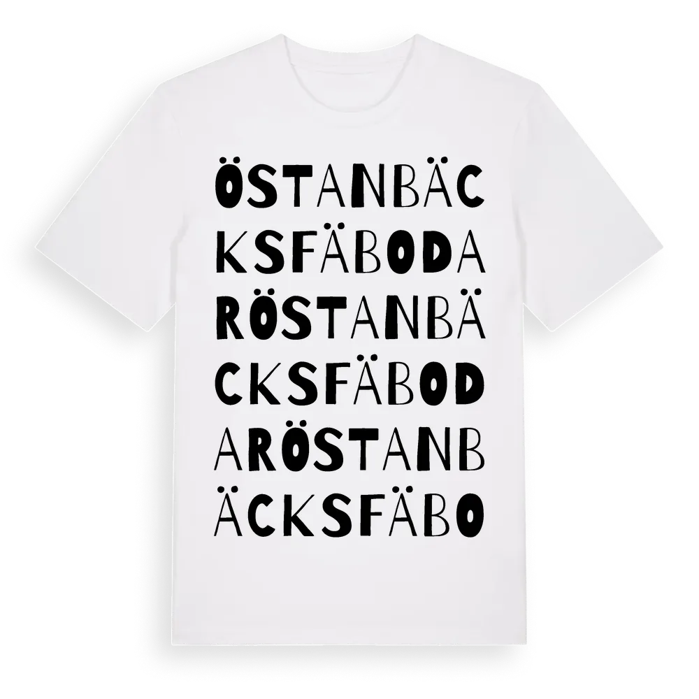 Östanbäcks Fäbodar ordlek t-shirt är inspirerad av byn Östanbäcks Fäbodar i Gävleborgs län, Sverige. Tröjan är designad för dig som har en speciell koppling till platsen – oavsett om du bor här, har rötterna här eller bara älskar Östanbäcks Fäbodar.