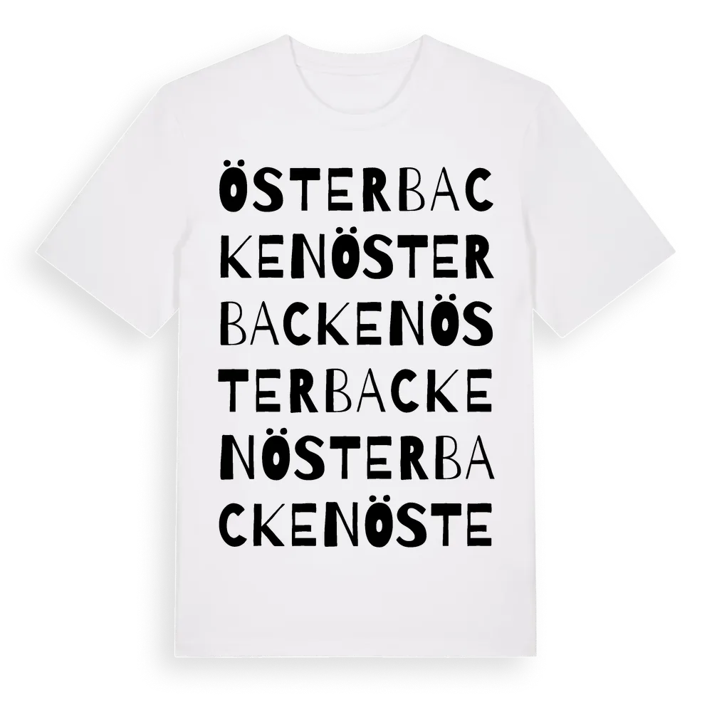 En ordlek byggd på Österbackens namn. Subtilt och klurig – ett motiv som bara de som verkligen känner platsen fullt ut förstår. Premium bomull, unisex – från stadsdelen Österbacken i Gävleborgs län.