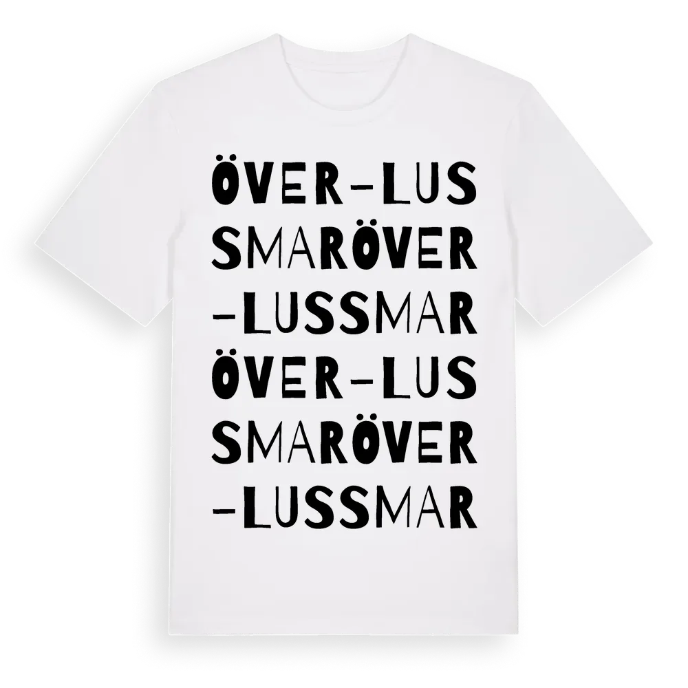 Över-Lussmar ordlek t-shirt är inspirerad av Över-Lussmar i Gävleborgs län, Sverige. Tröjan är designad för dig som har en speciell koppling till platsen – oavsett om du bor här, har rötterna här eller bara älskar Över-Lussmar.