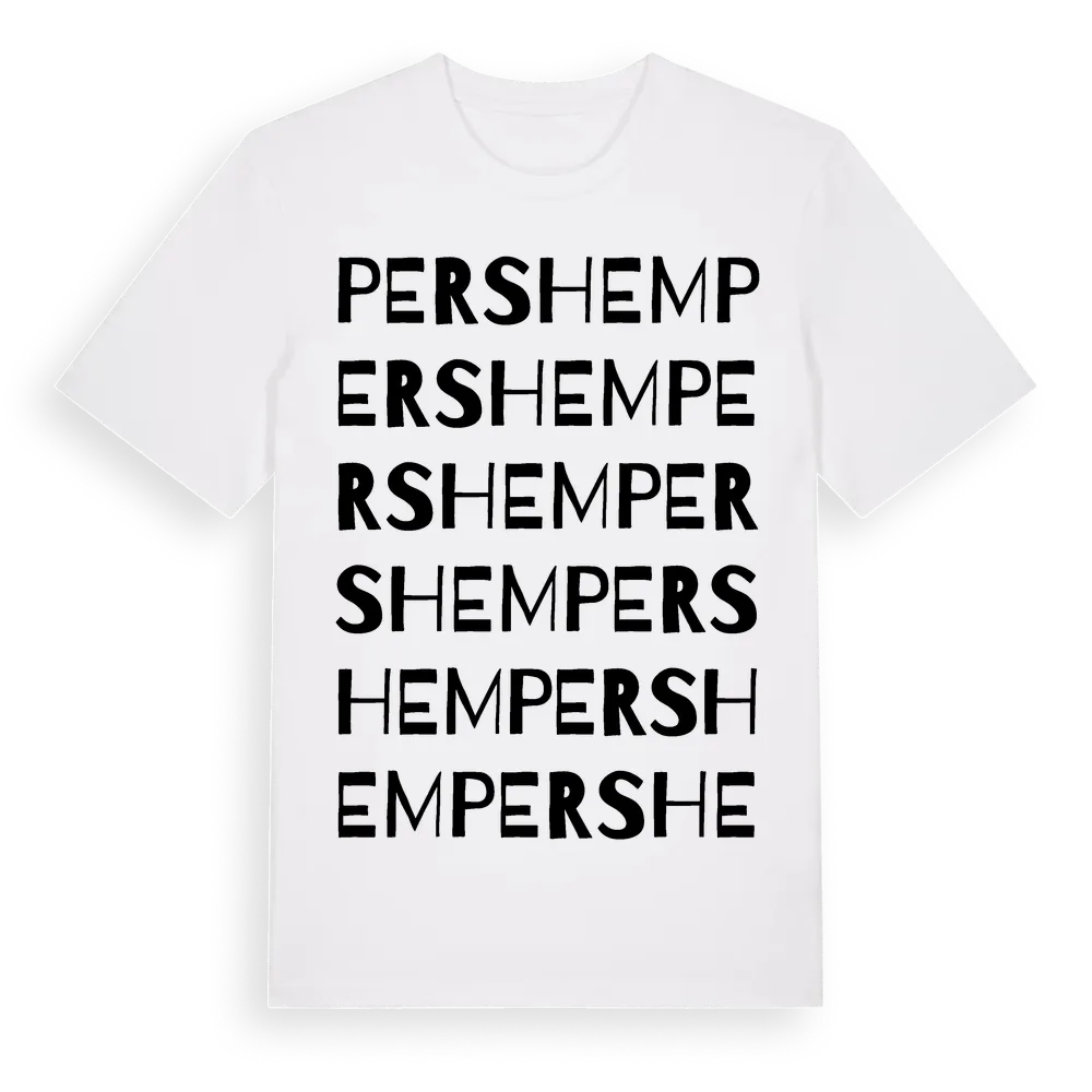 Pershem ordlek t-shirt är inspirerad av Pershem i Gävleborgs län, Sverige. Tröjan är designad för dig som har en speciell koppling till platsen – oavsett om du bor här, har rötterna här eller bara älskar Pershem.