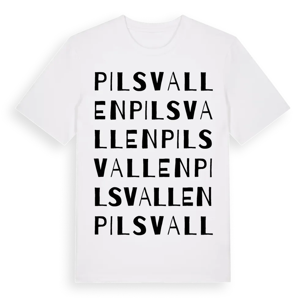 Pilsvallen ordlek t-shirt är inspirerad av Pilsvallen i Gävleborgs län, Sverige. Tröjan är designad för dig som har en speciell koppling till platsen – oavsett om du bor här, har rötterna här eller bara älskar Pilsvallen.