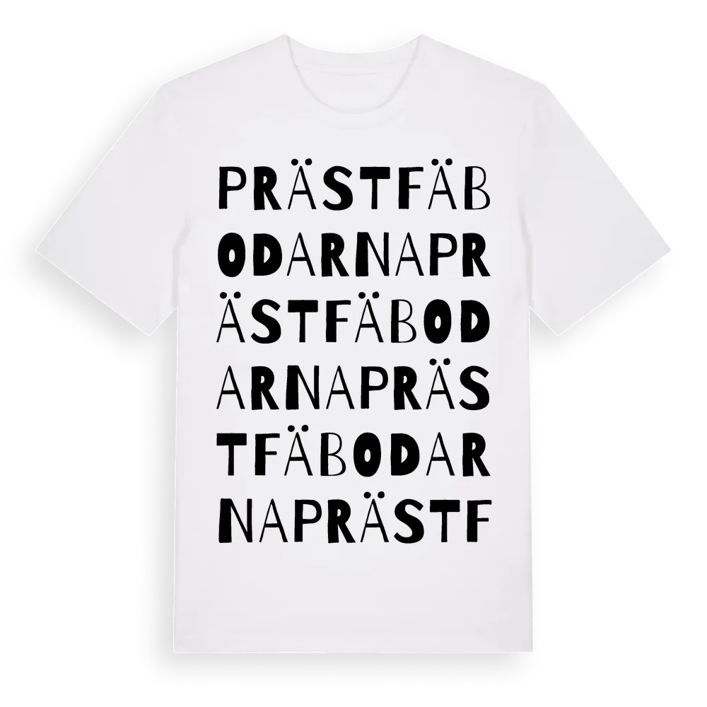 Prästfäbodarna ordlek t-shirt är inspirerad av Prästfäbodarna i Gävleborgs län, Sverige. Tröjan är designad för dig som har en speciell koppling till platsen – oavsett om du bor här, har rötterna här eller bara älskar Prästfäbodarna.
