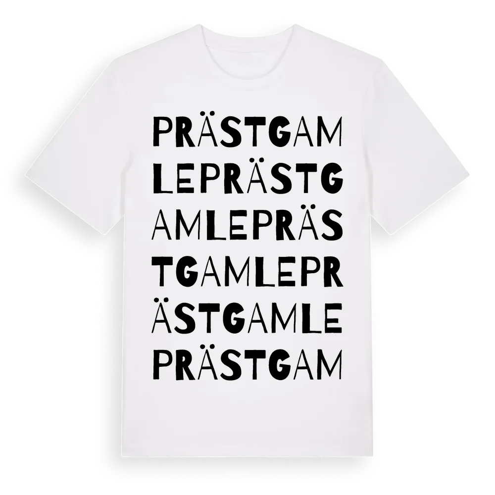 Prästgamle ordlek t-shirt är inspirerad av Prästgamle i Gävleborgs län, Sverige. Tröjan är designad för dig som har en speciell koppling till platsen – oavsett om du bor här, har rötterna här eller bara älskar Prästgamle.