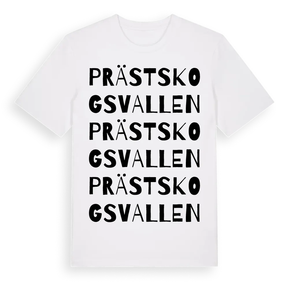 Prästskogsvallen ordlek t-shirt är inspirerad av Prästskogsvallen i Gävleborgs län, Sverige. Tröjan är designad för dig som har en speciell koppling till platsen – oavsett om du bor här, har rötterna här eller bara älskar Prästskogsvallen.
