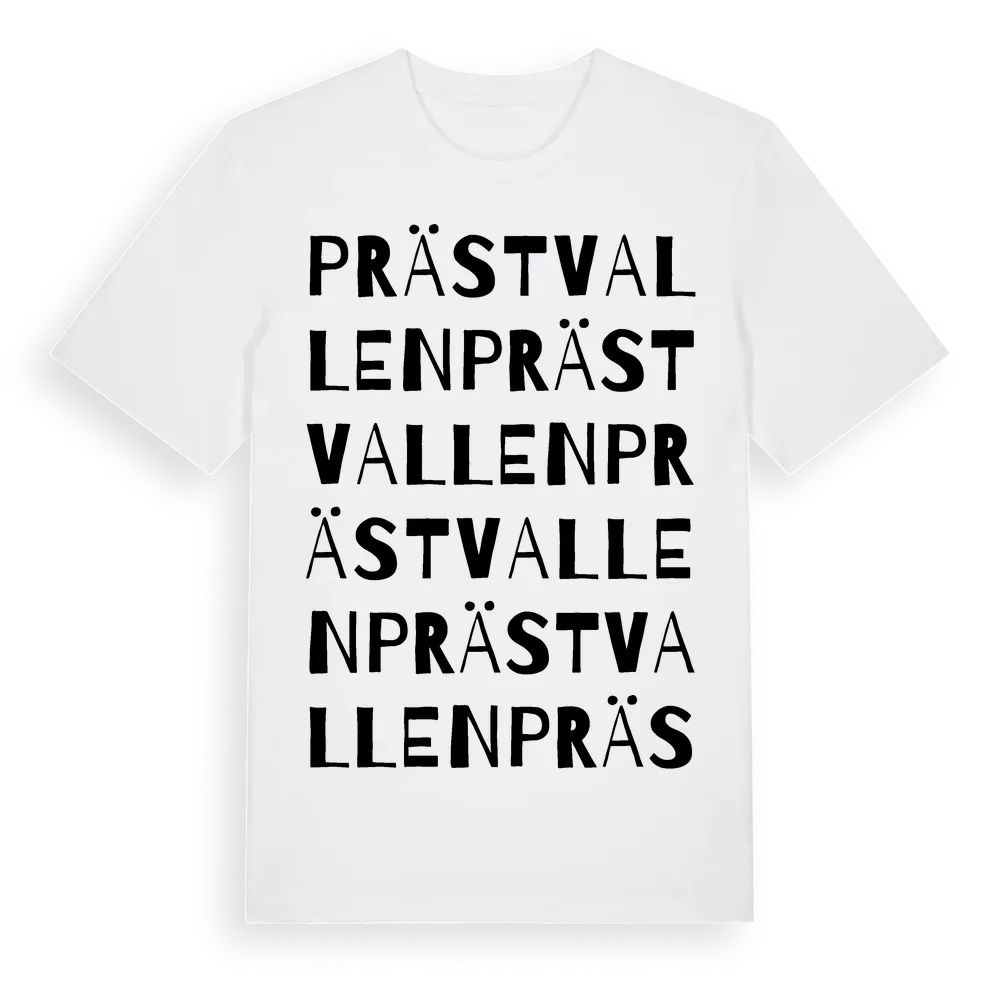 Prästvallen ordlek t-shirt är inspirerad av Prästvallen i Gävleborgs län, Sverige. Tröjan är designad för dig som har en speciell koppling till platsen – oavsett om du bor här, har rötterna här eller bara älskar Prästvallen.