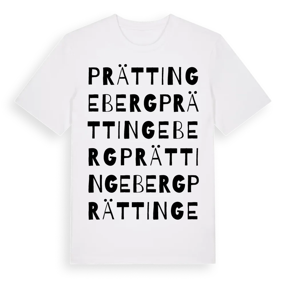 Prättingeberg ordlek t-shirt är inspirerad av Prättingeberg i Gävleborgs län, Sverige. Tröjan är designad för dig som har en speciell koppling till platsen – oavsett om du bor här, har rötterna här eller bara älskar Prättingeberg.