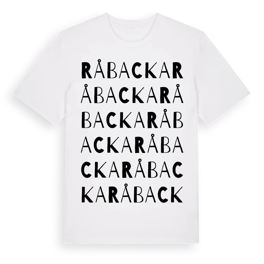 Råbacka ordlek t-shirt är inspirerad av byn Råbacka i Gävleborgs län, Sverige. Tröjan är designad för dig som har en speciell koppling till platsen – oavsett om du bor här, har rötterna här eller bara älskar Råbacka.