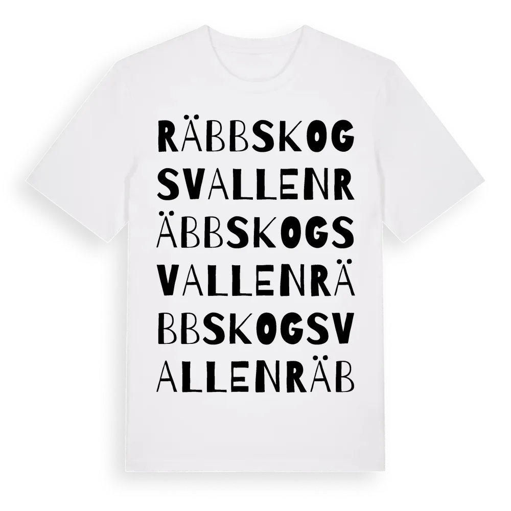 Räbbskogsvallen ordlek t-shirt är inspirerad av Räbbskogsvallen i Gävleborgs län, Sverige. Tröjan är designad för dig som har en speciell koppling till platsen – oavsett om du bor här, har rötterna här eller bara älskar Räbbskogsvallen.