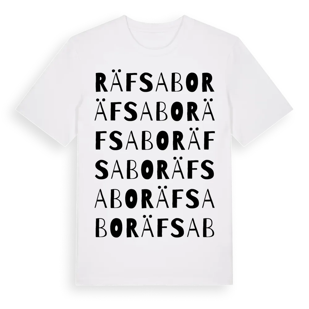 Räfsabo ordlek t-shirt är inspirerad av Räfsabo i Gävleborgs län, Sverige. Tröjan är designad för dig som har en speciell koppling till platsen – oavsett om du bor här, har rötterna här eller bara älskar Räfsabo.