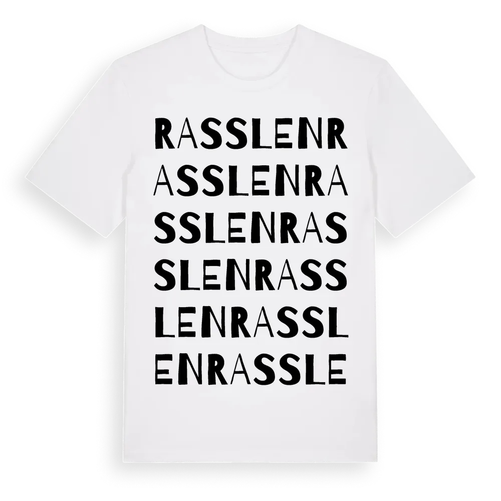 Rasslen ordlek t-shirt är inspirerad av Rasslen i Gävleborgs län, Sverige. Tröjan är designad för dig som har en speciell koppling till platsen – oavsett om du bor här, har rötterna här eller bara älskar Rasslen.
