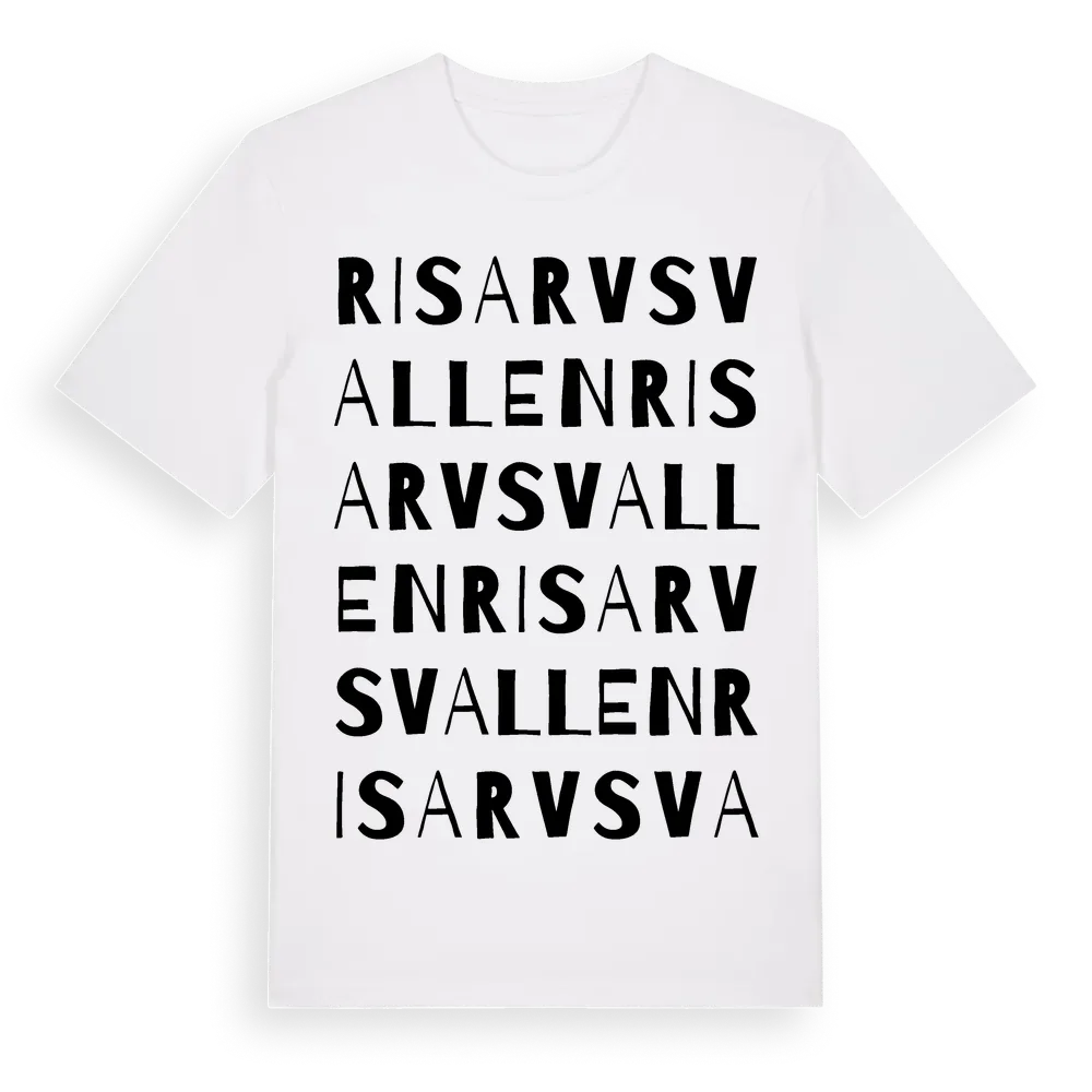Risarvsvallen ordlek t-shirt är inspirerad av byn Risarvsvallen i Gävleborgs län, Sverige. Tröjan är designad för dig som har en speciell koppling till platsen – oavsett om du bor här, har rötterna här eller bara älskar Risarvsvallen.